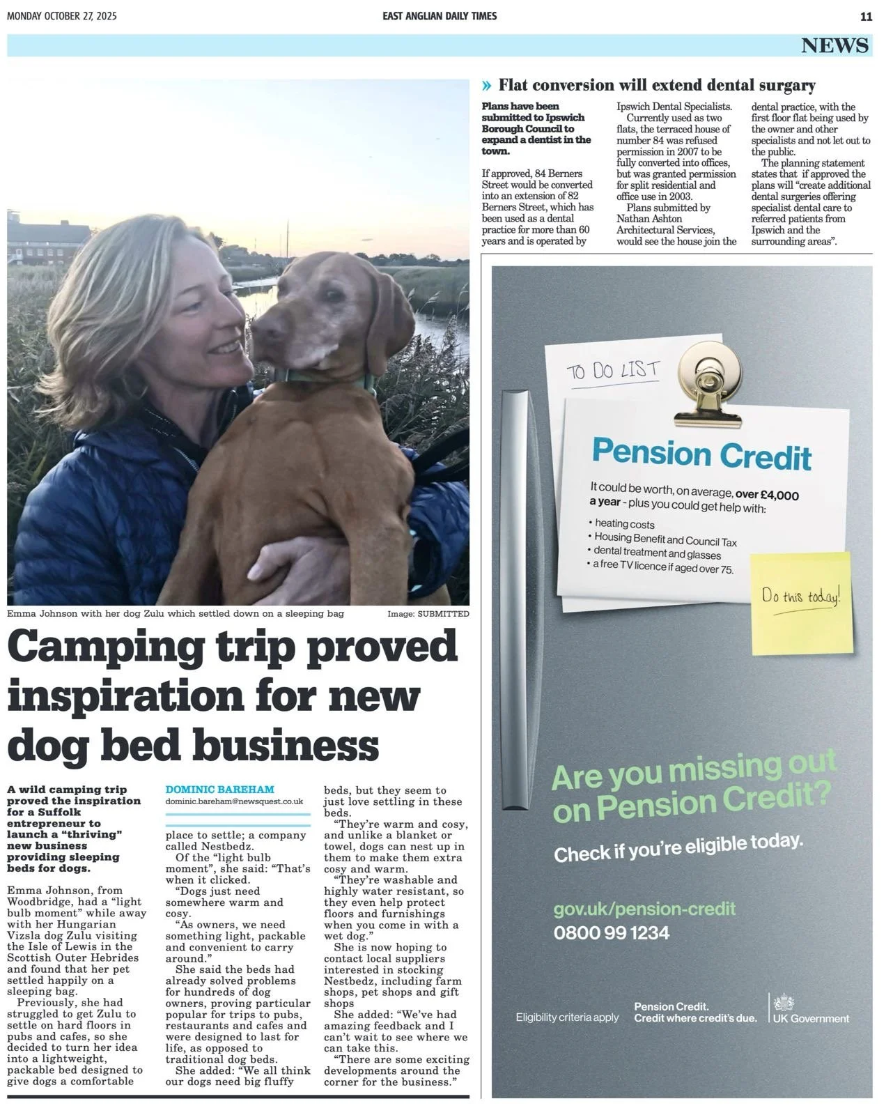 Emma Johnson 30/10/2025 Emma Johnson 30/10/2025 In the news Read More Emma Johnson 18/09/2025 Emma Johnson 18/09/2025 Helping your dog settle, anywhere. Read More Emma Johnson 02/10/2024 Emma Johnson 02/10/2024 The Power of Walking Read More Emma Johnson 17/09/2024 Emma Johnson 17/09/2024 Perfect for Adventures Read More Emma Johnson 20/05/2024 Emma Johnson 20/05/2024 Help to settle your dog in a pub/cafe Read More Emma Johnson 02/11/2022 Emma Johnson 02/11/2022 Why Nestbedz? Read More Emma Johnson 24/08/2022 Emma Johnson 24/08/2022 Facts about the Vizsla ❤️ Read More Emma Johnson 20/05/2022 Emma Johnson 20/05/2022 The story so far… Launching Nestbedz… Read More Emma Johnson 03/06/2019 Emma Johnson 03/06/2019 The mission Nestbedz, ready for adventures Read More
